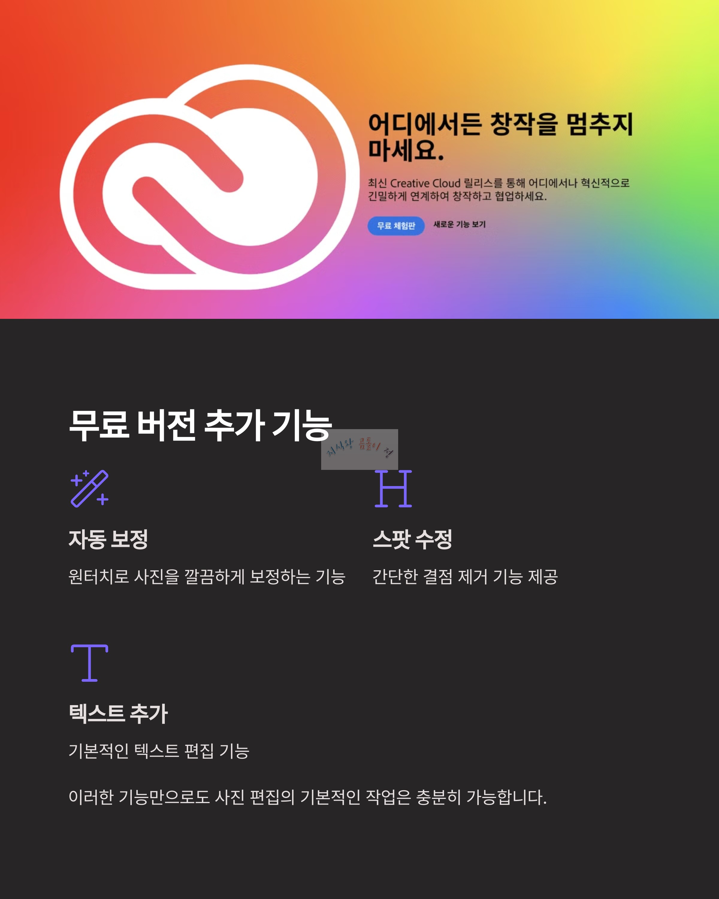 모바일 버전은 어도비에서 제공하는 Adobe Photoshop Express라는 앱을 통해 제공되며, 무료 기능만으로도 사진 편집에 필요한 핵심 기능들을 충분히 사용할 수 있습니다.