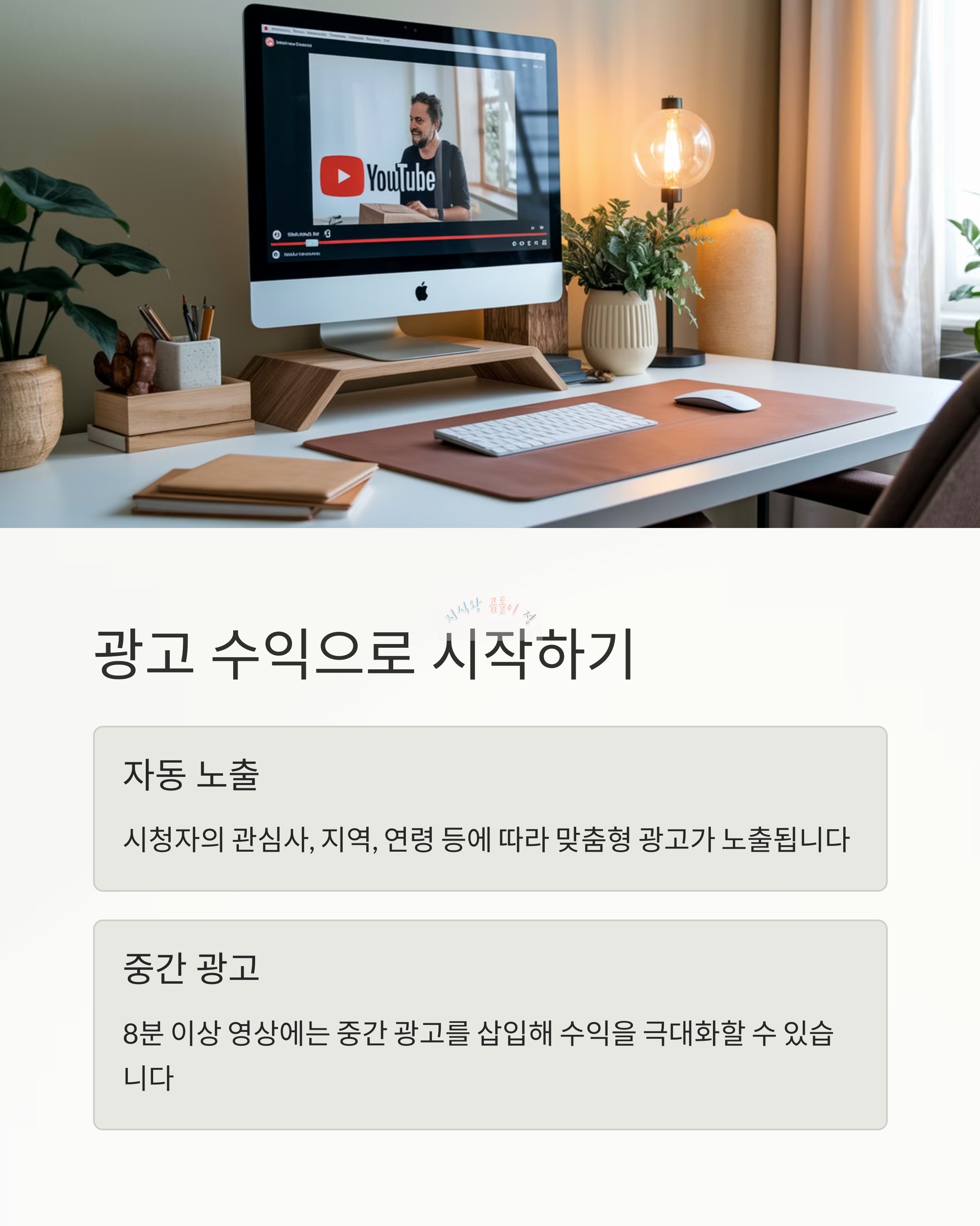 - 영상 길이가 8분 이상일 경우 영상 중간에도 광고를 삽입할 수 있어 수익 극대화가 가능합니다.