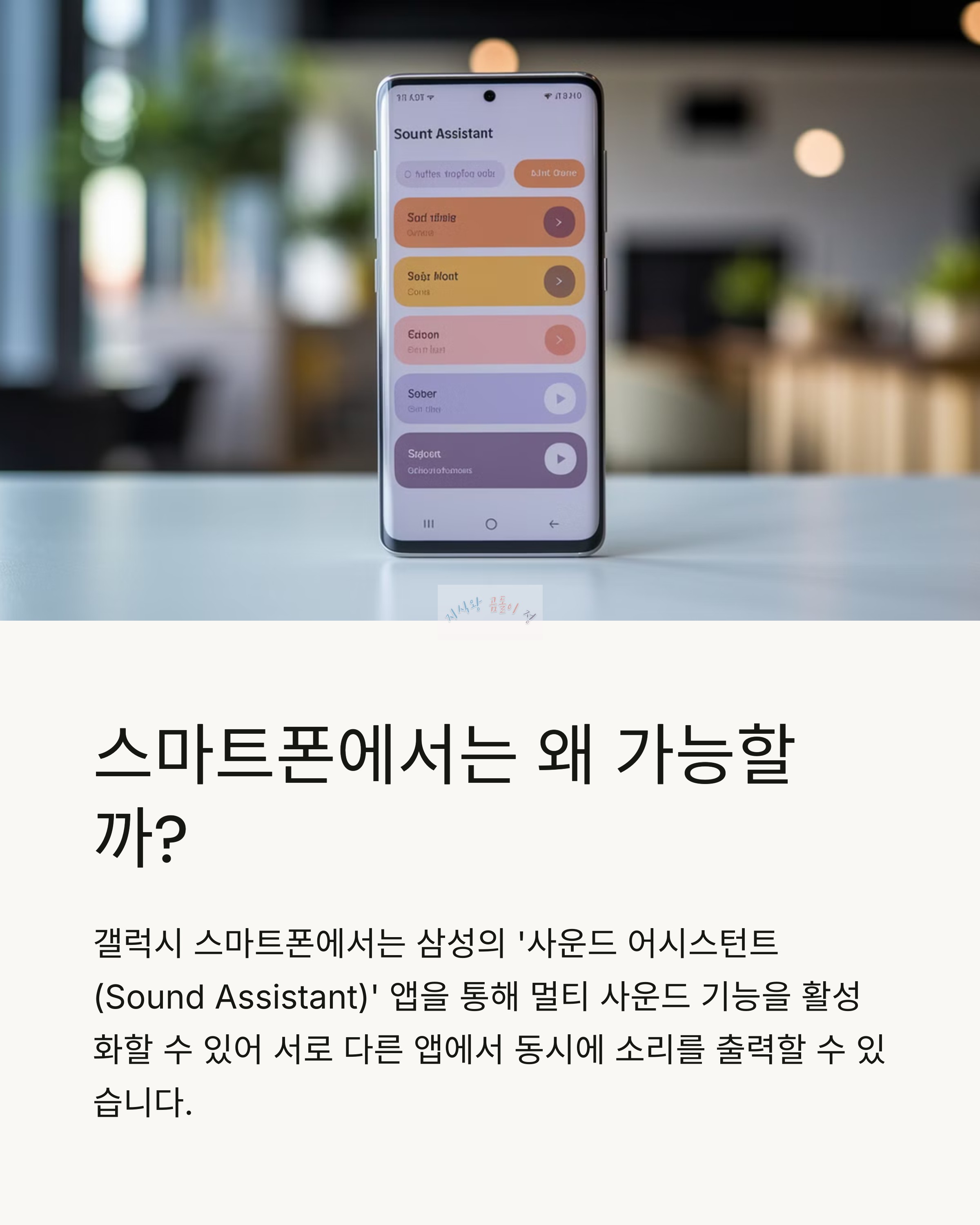 갤럭시 스마트폰에서는 삼성의 '사운드 어시스턴트(Sound Assistant)' 앱을 이용하면 멀티 사운드 기능을 활성화할 수 있습니다.
