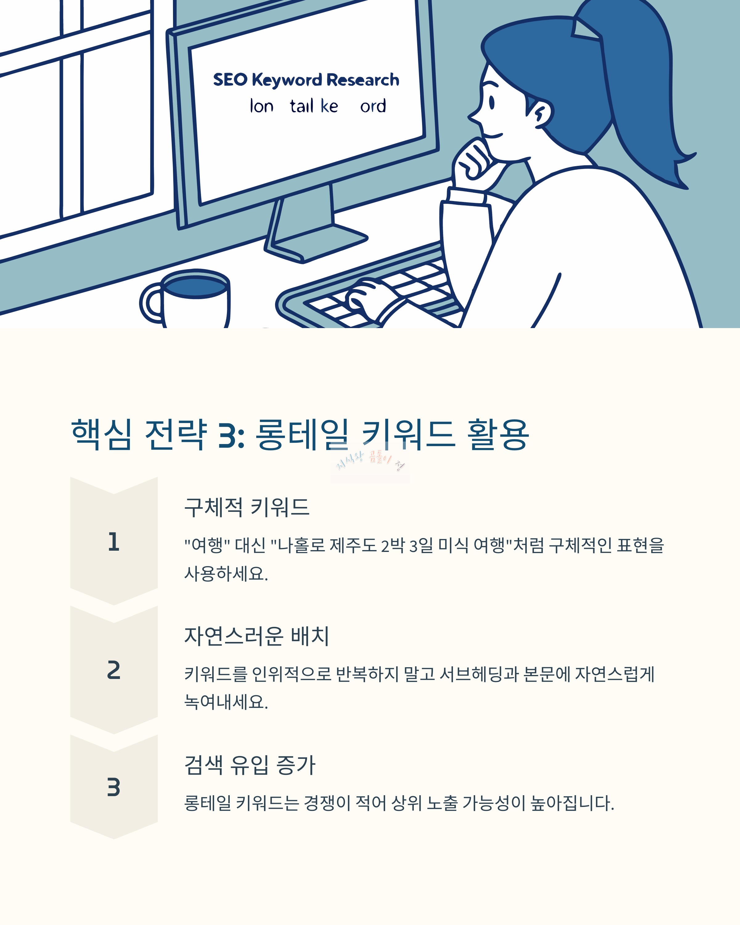 반면 “나홀로 제주도 2박 3일 미식 여행”처럼 구체적이고 긴 표현, 즉 롱테일 키워드는 경쟁이 비교적 적습니다.