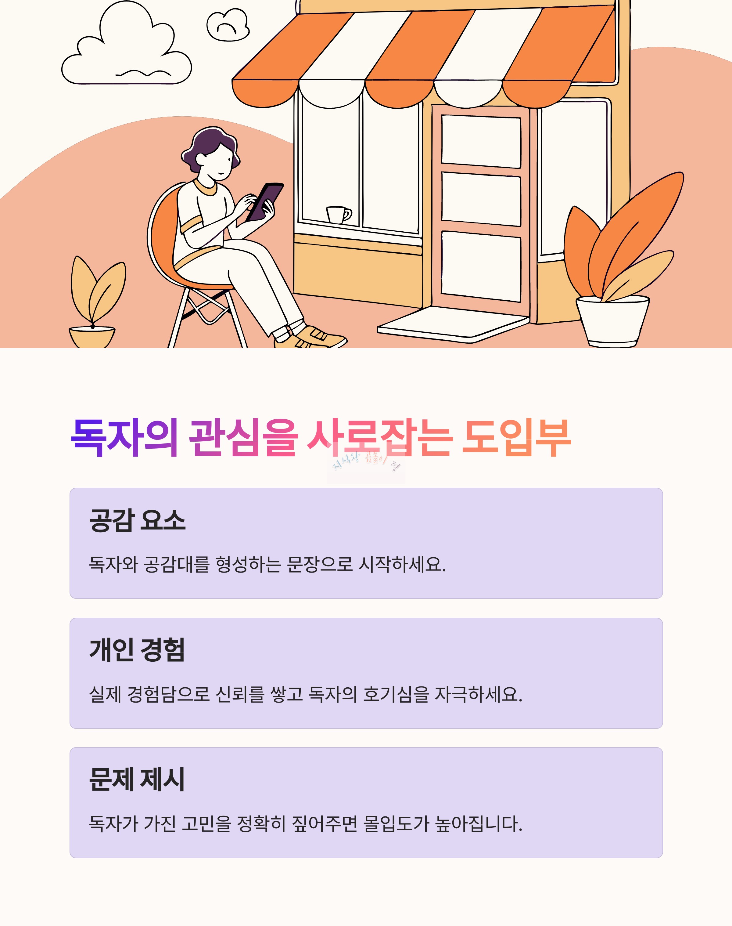 따라서 도입부에서는 공감 요소개인적인 경험담을 활용해 독자의 시선을 붙잡는 것이 중요해요.