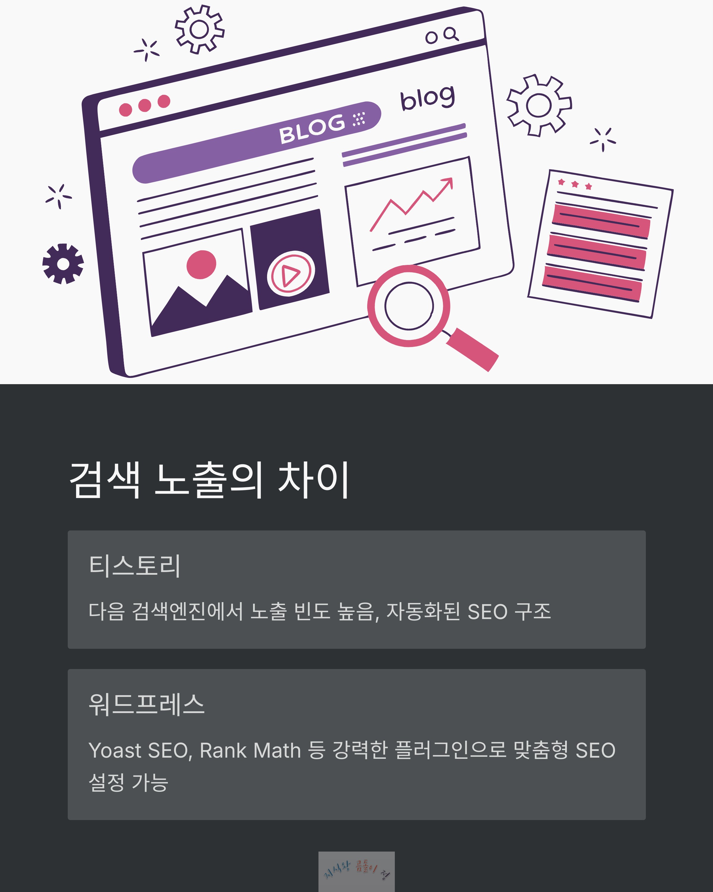 빠른 노출은 티스토리, 정교한 SEO 최적화는 워드프레스라고 생각하면 이해가 쉬워요.