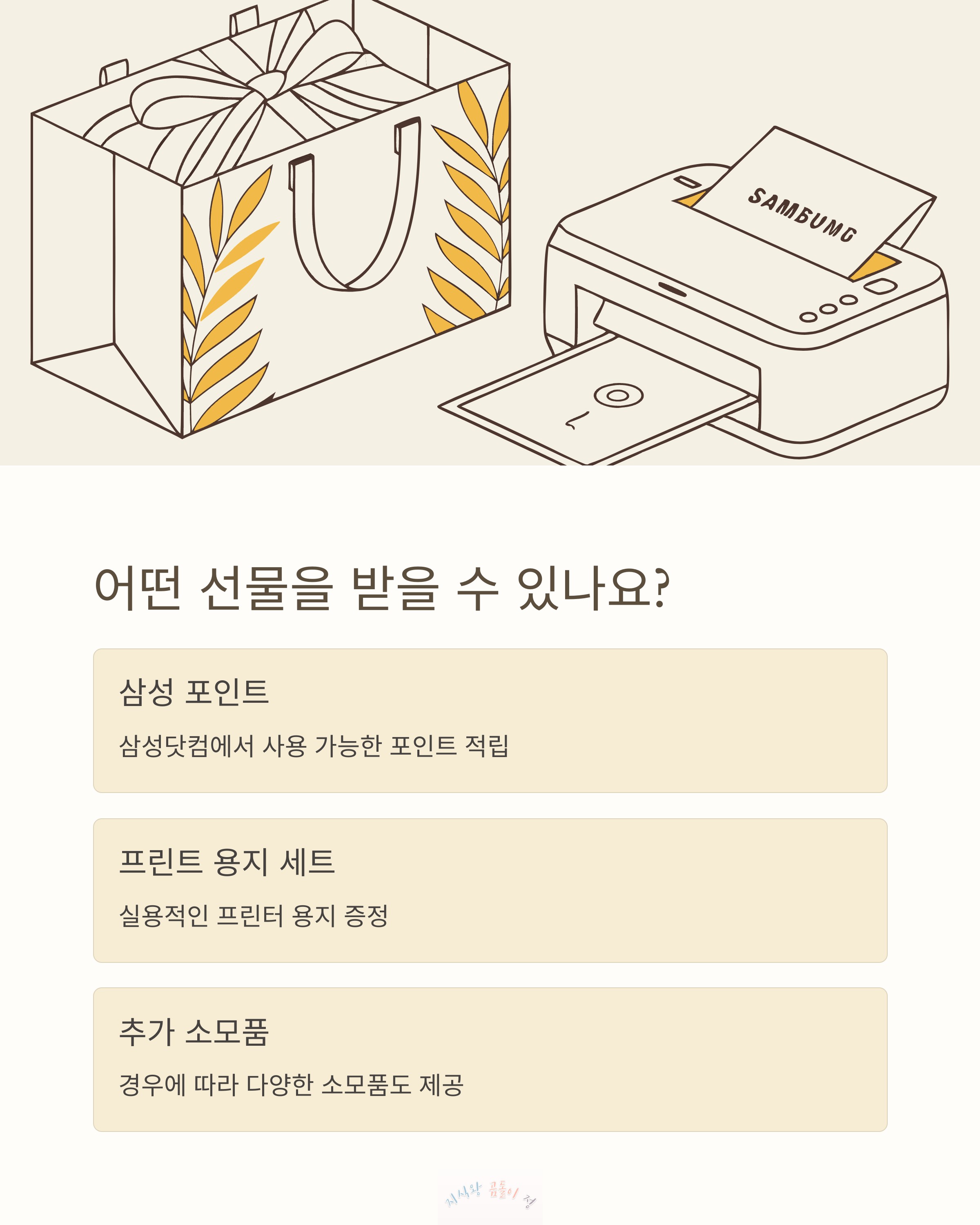 제 경우에는 삼성 포인트와 함께 프린트 용지 세트를 받았어요. 포인트는 삼성닷컴에서 사용할 수 있어서 꽤 유용하더라고요.