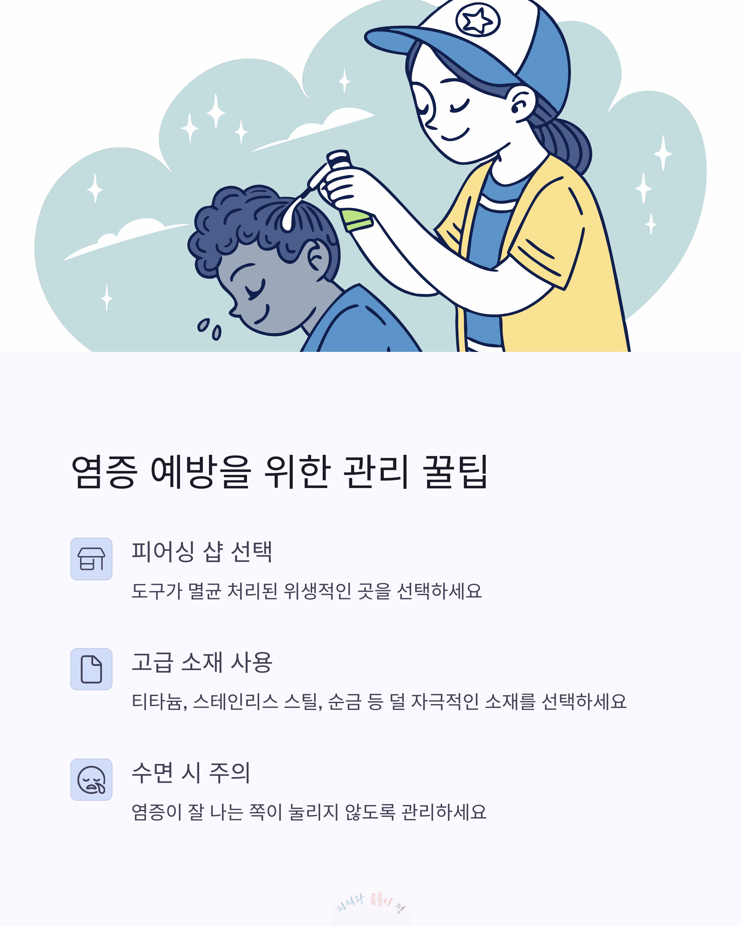 - 피어싱 부위를 만지지 말고, 머리 빗을 때도 조심하세요.