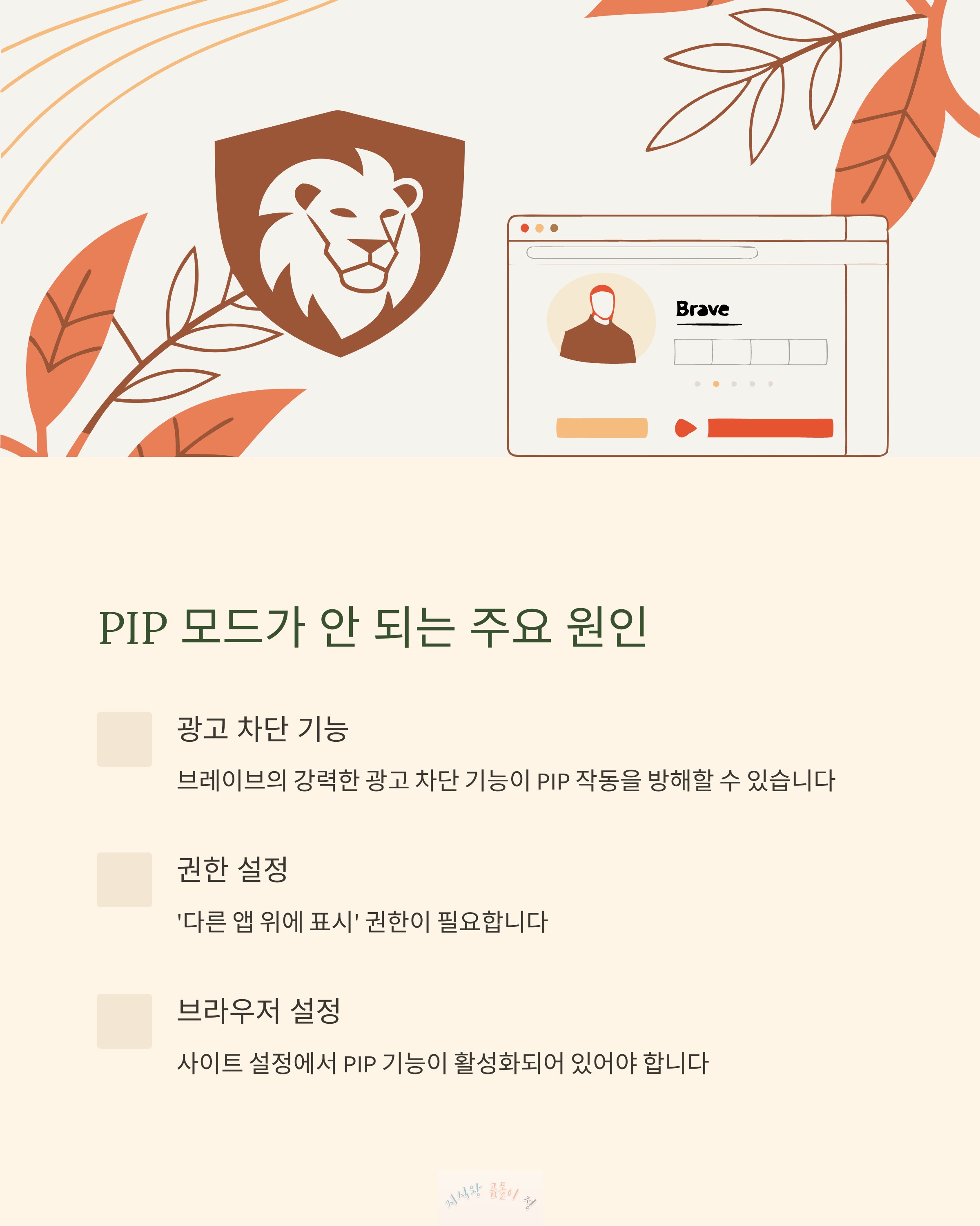 최근에 브레이브 브라우저를 사용하면서 PIP(화면 속 화면) 재생 모드가 안 되는 문제를 겪었어요.