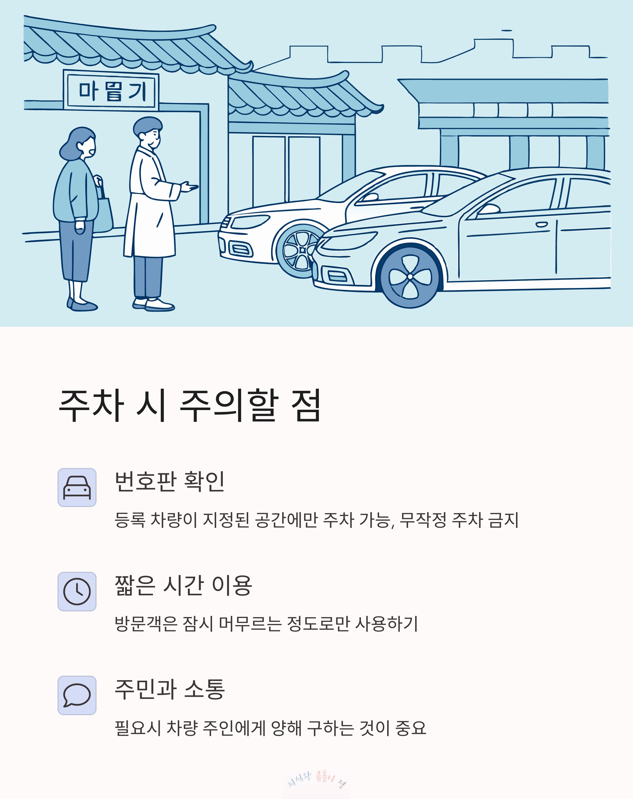 - 긴 시간 주차는 피하기: 방문객이라면 잠시 머무르는 정도로만 사용하는 게 좋아요.