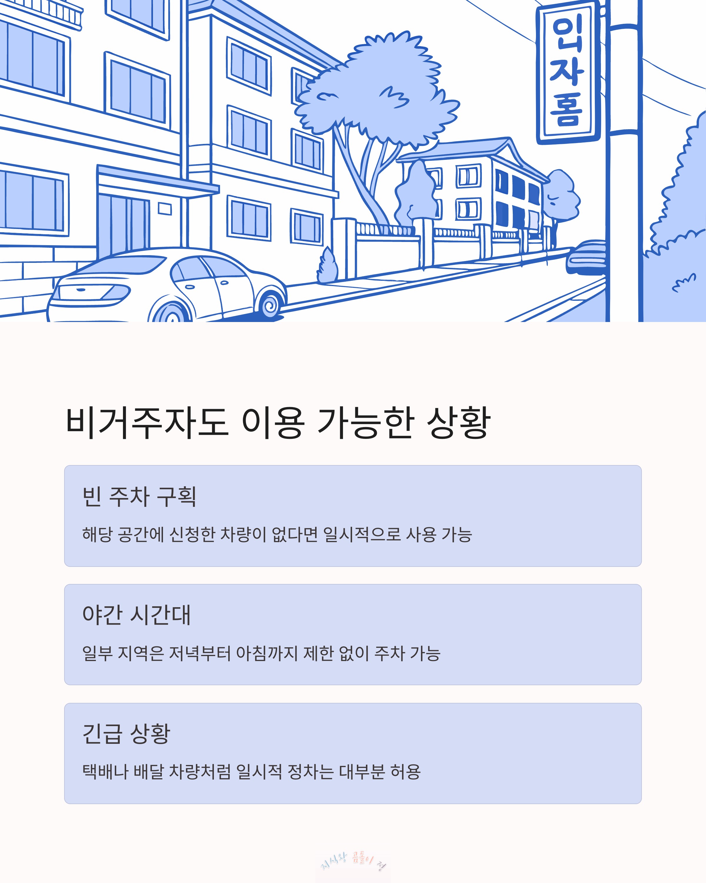 - 주차 구획이 비어있을 경우: 해당 공간에 신청한 차량이 없다면 일시적으로 사용할 수 있어요.