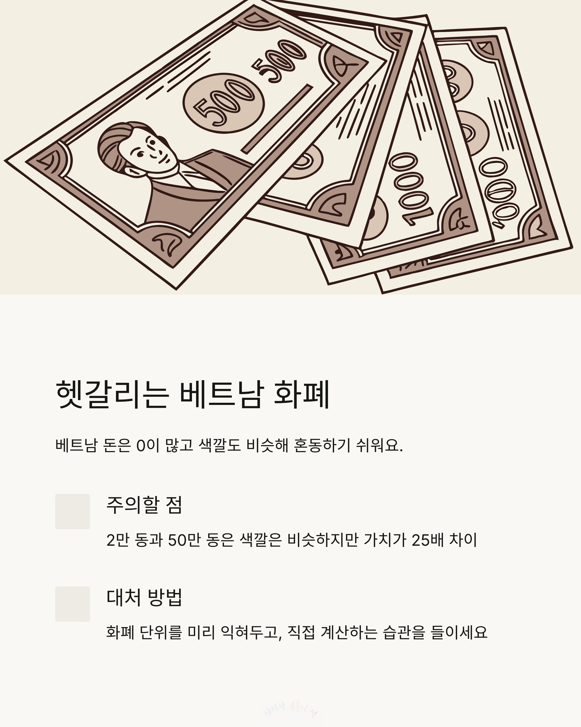 ➡️ 화폐 단위를 미리 익혀두고, 직접 계산하세요. 급하게 처리하려 하지 마세요.