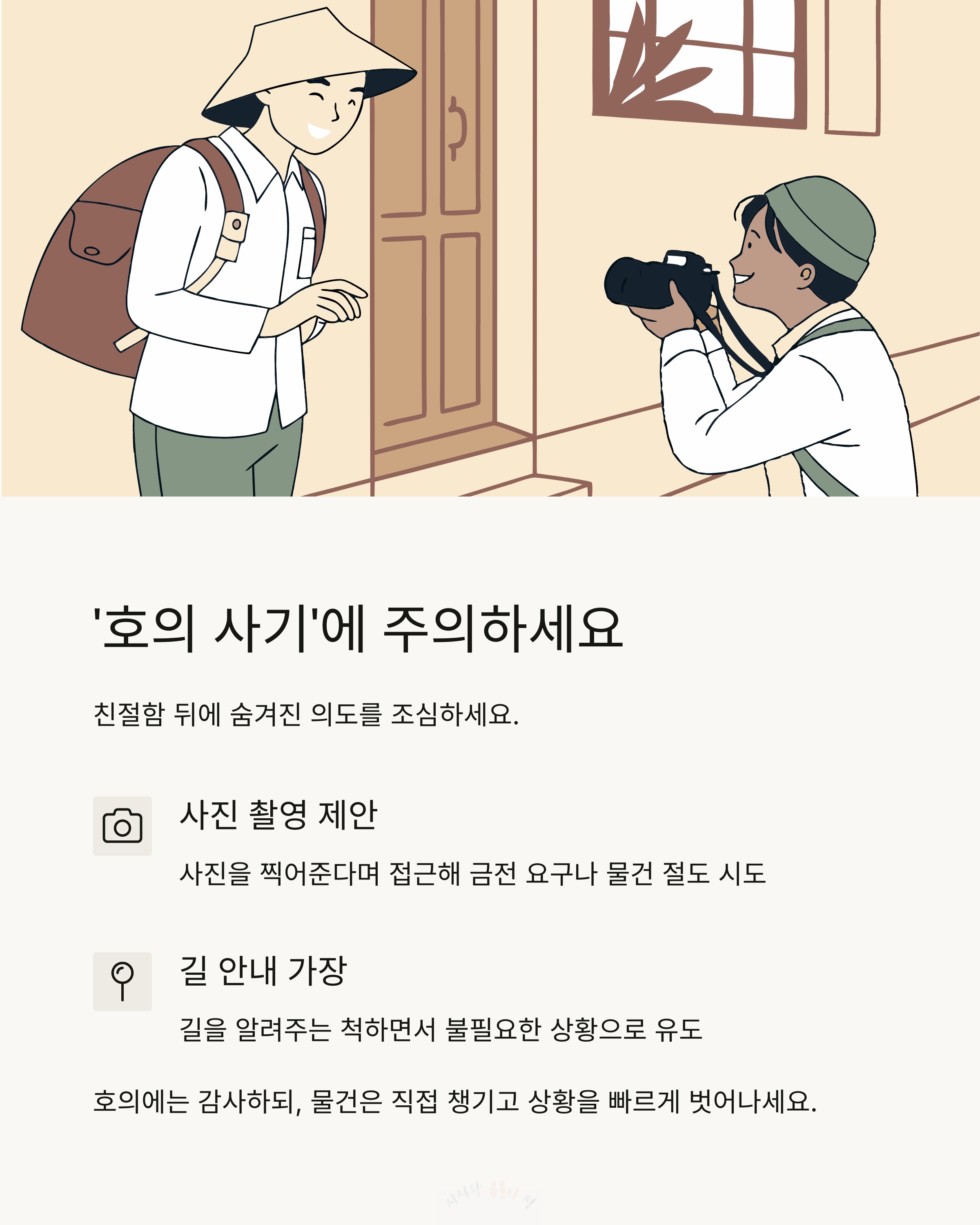 사진을 찍어준다거나 친절하게 길을 알려주는 척 하면서, 금전 요구나 물건 절도 등의 일이 발생할 수 있어요.