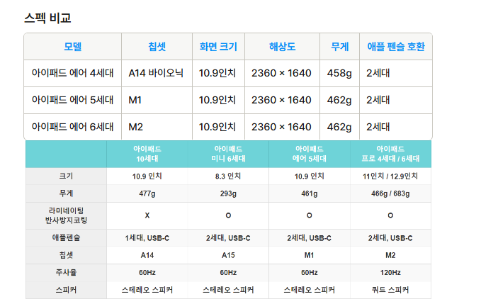 | 아이패드 에어 5세대 | M1 | 10.9인치 | 2360 x 1640 | 462g | 2세대 |