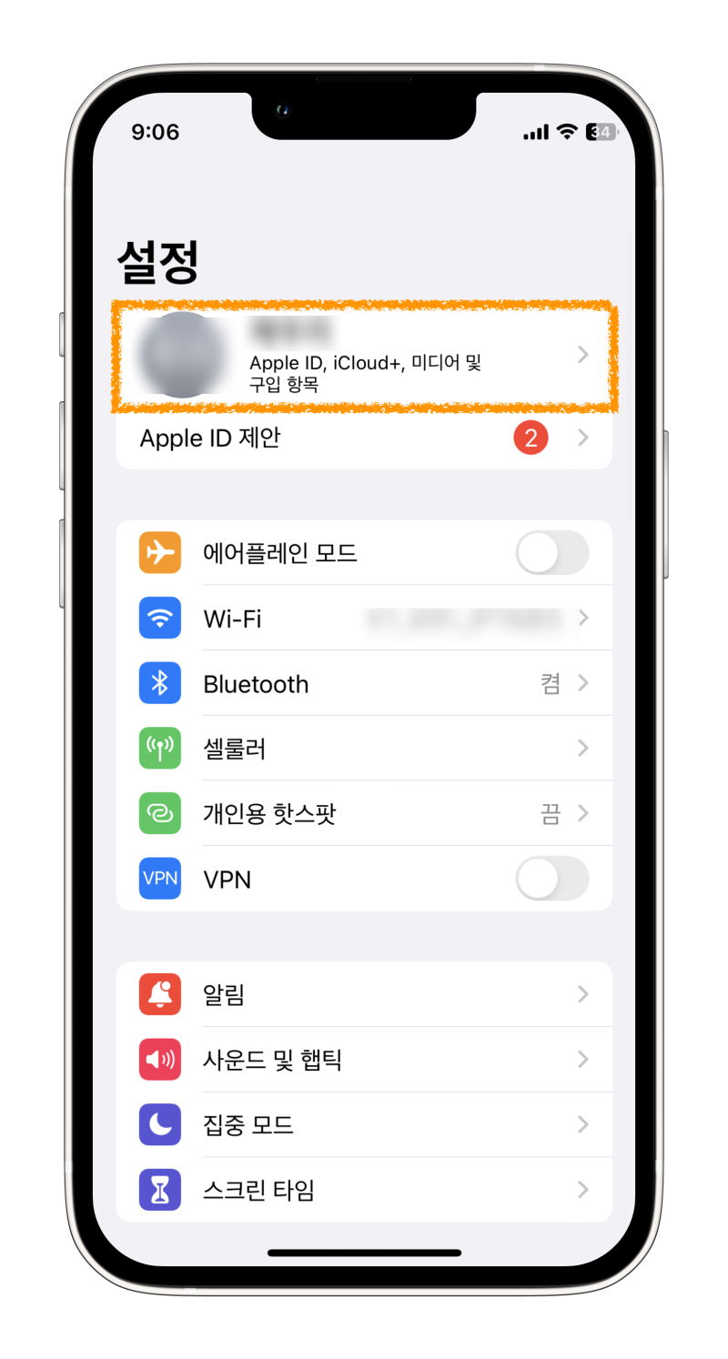 2. [Apple ID] (상단에 본인 이름이 표시된 부분)을 선택합니다.