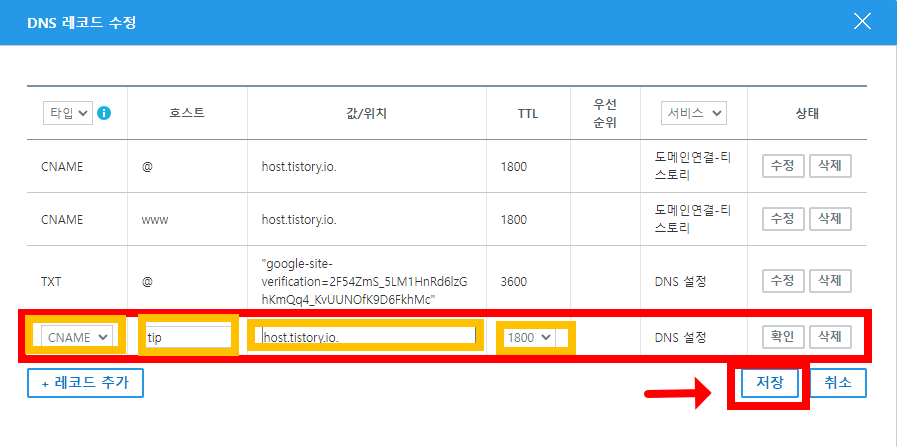 3. 구매한 도메인의 하위 도메인을 입력합니다. 예: tistory.example.com