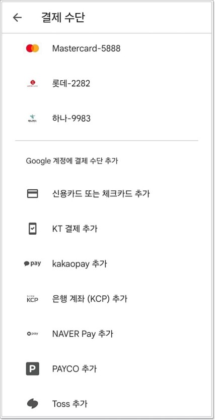 - **구글 플레이스토어 → [결제 및 구독] → [결제 방법]**으로 이동합니다.