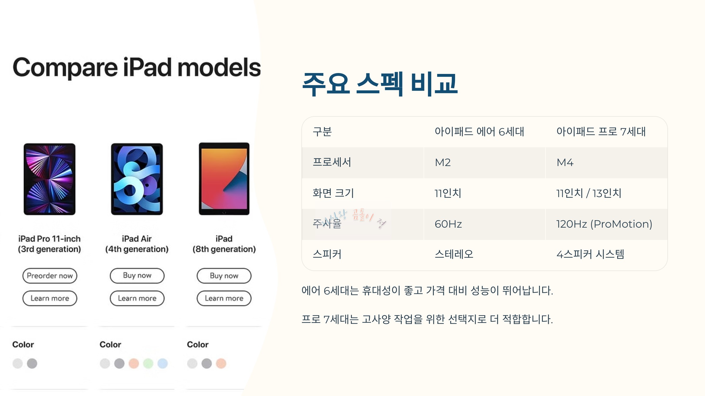 - 학생이라면 에어 6세대, 전문적인 작업이 필요하다면 프로 7세대가 좋은 선택